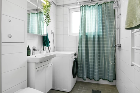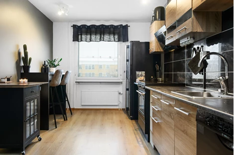 Denna fräscha trea på andra våningen bjuder på ett snyggt kök, totalrenoverat 2017 med utbytta stilrena vitvaror i svart där spis och diskmaskin är från 2021. Vid stambytet 2020 totalrenoverades och helkaklades badrummet i föreningens regi. Tvättmaskinen installerades 2021.