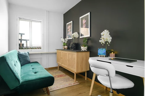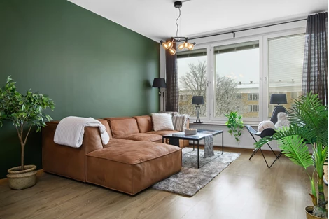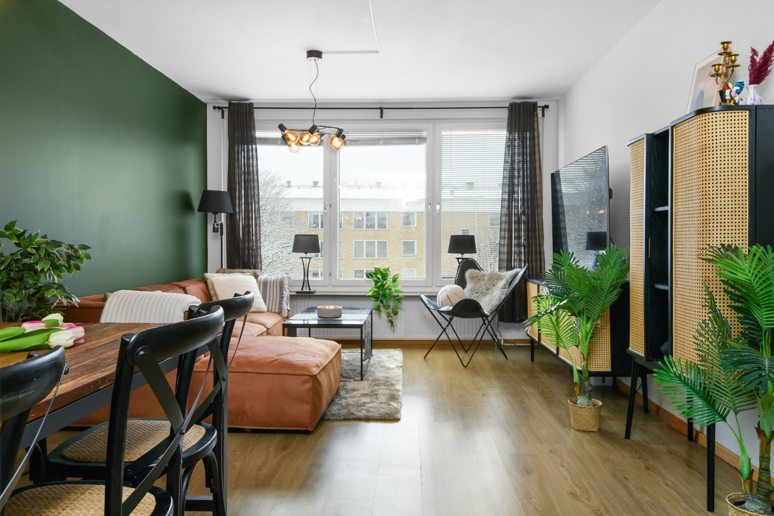Vardagsrummet, med sin generösa storlek, erbjuder utsikt över den grönskande innergården med sina stora fönsterpartier. Här har man plats för både matbord och stor inbjudande soffa.